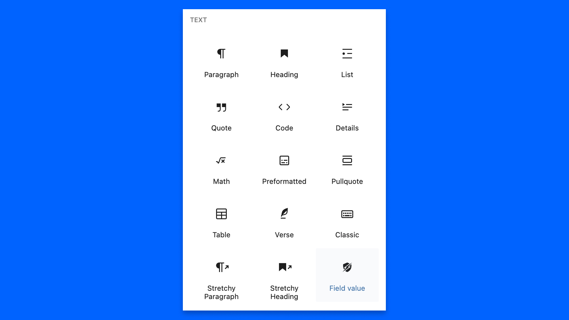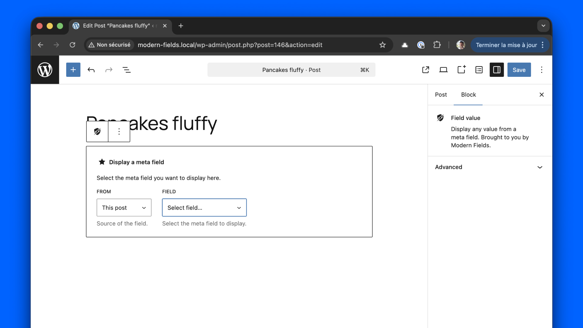 Modern Fields provide a block to show any value from your custom fields, so you don’t need code to display informations in your posts and templates.